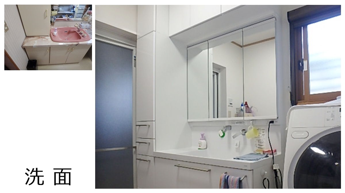 間仕切壁に面している洗面化粧台は一度外さなければならないので、この機会に洗面化粧台も収納しやすい引き出しタイプへの交換をお勧めしました。